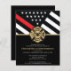 This design features a firemen's flag with black and white stripes, and a thin red line stripe as well. A fireman's badge sits above all of the party details for the graduating firefighter. This design also works great for a retiring firefighter, lieutenant, or chief's retirement party.
