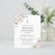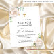 A white background decorated with eucalyptus greenery, white florals (peonies), golden leaves. Personalise and a name and ceremony details.