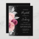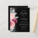 The left-hand edge of this elegant modern wedding invitation features a floral bouquet in shades of burgundy and blush pink, trimmed with silver faux foil and faux glitter foliage and sprinkled with silver faux glitter. The customisable text combines silver grey handwriting script, copperplate and italic fonts on a black background. The reverse side provides space for wedding details on a solid black background, along with a QR code guests can scan to visit your website and RSVP.