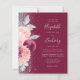 The left-hand edge of this elegant modern wedding invitation features a floral bouquet in shades of burgundy and blush pink, trimmed with silver faux foil and faux glitter foliage and sprinkled with silver faux glitter. The customisable text combines silver grey handwriting script, copperplate and italic fonts on a burgundy background. The reverse side provides space for wedding details on a solid burgundy background, along with a QR code guests can scan to visit your website and RSVP.