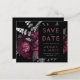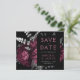 This elegant, moody wedding Save the Date card features a lush, romantic floral bouquet in burgundy red with silver faux foil and glitter foliage on a black background. Customise the silver grey and pale burgundy text in stylish fonts on a black rectangle, and add your wedding website URL to the solid black back.