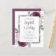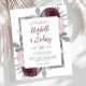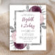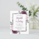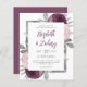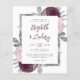 This design features lush bouquets of mauve, dusty pink and silver flowers adorning a silver faux foil rectangular frame. Customise the text on a white background with the first names of the bride and groom in modern mauve handwriting script, with the date, time and wedding venue in charcoal grey sans serif font. The back of the card is a matching shade of solid mauve.