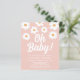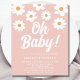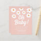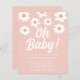 This pretty floral budget baby shower invitation is decorated with hand-drawn daisies and Oh Baby! in white retro typography on a pink background.
