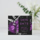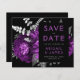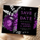 This elegant, moody wedding Save the Date card features a lush, romantic floral bouquet in plum purple with silver faux foil and glitter foliage on a black background. Customise the silver grey and plum text in stylish fonts on a black rectangle, and add your wedding website URL to the solid black back.