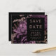 This elegant, moody wedding Save the Date card features a lush, romantic floral bouquet in purple with rose gold faux foil and glitter foliage on a black background. Customise the rose-coloured text in stylish fonts on a black rectangle. Add additional details on the back, and enter your wedding website URL to generate a QR code.