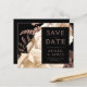 This elegant, moody wedding Save the Date card features a lush, romantic floral bouquet in ivory with rose gold faux foil and glitter foliage on a black background. Customise the rose-coloured text in stylish fonts on a black rectangle. Add additional details on the back, and enter your wedding website URL to generate a QR code.