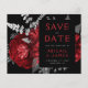 This elegant, moody wedding Save the Date card features a lush, romantic floral bouquet in red with silver faux foil and glitter foliage on a black background. Customise the silver grey and red text in stylish fonts on a black rectangle, and add your wedding website URL to the solid black back.