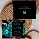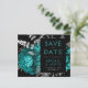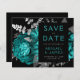 This elegant, moody wedding Save the Date card features a lush, romantic floral bouquet in teal blue with silver faux foil and glitter foliage on a black background. Customise the silver grey and teal text in stylish fonts on a black rectangle. Add additional details on the back, and enter your wedding website URL to generate a QR code.