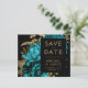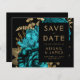 This elegant, moody wedding Save the Date card features a lush, romantic floral bouquet in turquoise with gold faux foil and glitter foliage on a black background. Customise the gold-coloured text in stylish fonts on a black rectangle, and add your wedding website URL to the solid black back.