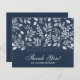These navy blue flat thank you notes are an excellent value printed on 110 lb paper and feature a white leaf pattern, the words "Thank You" and your name in chic white lettering on the front and your personal message on the back. Perfect thank you notes for your wedding, bridal shower, baby shower, birthday, anniversary, graduation, or any special event. WHITE envelopes are optional. Measures 4.5" x 5.6", but you can choose from 3 paper sizes. MORE COLORS in our collection.