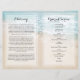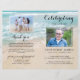 Budget funeral memorial program featuring on the front a photo of your loved one, their name, dates, the memorial venue, date of the event, and a summer beach ocean shoreline background. On the inside is an obituary, and order of service; and on the back another photo, a thank you note and the second venue for after the funeral. PLEASE NOTE: These come as a flat piece of quality paper, you will need to fold them yourself.