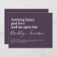 Invite friends and family to join you for your wedding celebrations with this funny wedding invitation. The text reads "Nothing fancy just love and an open bar"