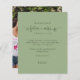Future Mrs Photo Bridal Shower Sage Green Thanks. A budget price SMALLER 4.5” x 5.6” alternative. Available in a SEMI GLOSS 110 lb CARD STOCK which is the default option (recommended for invitations), OR a SATIN FINISH 80 lb THINNER PAPER STOCK (ideal for enclosures). Envelopes are an optional extra and are slightly larger than the card size. The Future Mrs is in a playful artsy set script with engagement ring and heart motifs and the rest of the text you can easily personalise. Replace the sample photo on the back with a fun picture from your event.