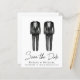 Budget-friendly no photo gay wedding save the date announcement featuring watercolors of two tuxedos and "Save the Date" in a stylish script. Add your names, wedding date and location in modern typography. On the reverse side, personalise your save the date announcement in more detail.