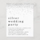 Glitter Silver Wedding 25 years Anniversary Party Invite. A budget price SMALLER 4.5” x 5.6” alternative. Available in a SEMI GLOSS 110 lb CARD STOCK which is the default option (recommended for invitations), OR a SATIN FINISH 80 lb THINNER PAPER STOCK (ideal for enclosures). Envelopes are an optional extra and are slightly larger than the card size. The header is large in stylish lowercase with the details beneath. Lots of white space at the top for a contemporary feel and a border of silver faux glitter on each side. Easily personalise the text to your own details.