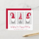 Budget-friendly minimal holiday card featuring three cute nordic Christmas gnomes with red and white seasonal Scandinavian style hats and light grey tunics. Personalise a "Happy Holidays, "Merry Christmas," etc., greeting in a red script and add your name and the year in simple modern typography.