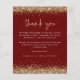 Gold Glitter Engagement Party Burgundy Thank You. A budget price SMALLER 4.5” x 5.6” alternative. Available in a SEMI-GLOSS 110 lb CARD STOCK which is the default option (thicker for invitations), OR a SATIN FINISH 80 lb THINNER PAPER STOCK (ideal for enclosures). Envelopes are an optional extra and are slightly larger than the card size. Gold faux glitter borders are at the top and bottom on each side, and Thank You is in a set handwritten style script in coordinating gold. Easily personalise the rest of the text. You can also change the text and background colours via the customise further option if you wish.