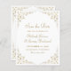 This elegant vintage-inspired formal wedding save the date card features the text in gold coloured script and serif fonts, framed by a delicate vintage gold vine motif. The frame is repeated on the reverse.