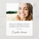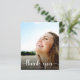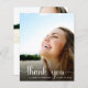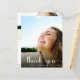 A budget-friendly graduation thank you card featuring the graduate's photo overlayed with "thank you" in a stylish white script with swashes and their name and class year in modern white typography. On the reverse side, add an additional photo, personalise a thank you message and add their name in a signature-like script.