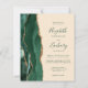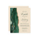 The left-hand edge of this elegant modern wedding invitation features an emerald green watercolor agate border trimmed with faux gold glitter. The customisable text combines green handwriting, copperplate and italic fonts on a champagne background. The reverse side provides space for wedding details on a solid champagne background, along with a QR code guests can scan to visit your website and RSVP.