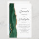 The left-hand edge of this elegant modern wedding invitation features an emerald green watercolor agate border trimmed with faux gold glitter. The customizable text combines charcoal gray script and sans serif fonts on a white background. The reverse side provides space for wedding details on a solid slate white background, along with a QR code guests can scan to visit your website and RSVP, which saves the cost of printing and mailing separate RSVP cards.