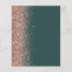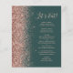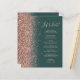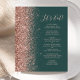 The left-hand edge of this elegant modern wedding menu features a rose gold faux glitter border. The customisable title and text combine rose pink whimsical handwriting script and copperplate fonts on a dark emerald green background. The reverse side features a matching green and rose gold glitter design.
