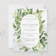 Elegant modern funeral invitation features a green and grey oval botanical frame. A soft grey watercolor wash gives it a quite and dignified air. The deceased person's name is written in a traditional script text. All of the text can be easily edited to create a personal remembrance.