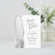 The left-hand edge of this elegant modern wedding save the date card features a grey and white watercolor agate border trimmed with faux silver glitter. The customisable text combines charcoal grey handwriting, copperplate and italic fonts on a white background. The reverse side features a matching grey and silver agate design.