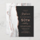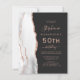 The left-hand edge of this elegant modern 50th birthday party invitation features a grey and white watercolor agate border trimmed with rose gold faux glitter. The customisable text combines rose-coloured handwriting, copperplate and italic fonts on a slate black background. The reverse side features a matching agate design.