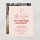 A fun and funky wedding invitation. The front of this budget card features a cream-pink background with cherry red typography. The couple's names are written in a modern handwriting-style script lettering font with "are getting married" in groovy retro typography. Above the names, there is a hand-drawn sparkle illustration. Below, the event details are printed in simple sans-serif capitals - a simple yet stylish design for a casual wedding. The cards reverse to a custom photo. The couple's names and the date of the big day are also on the back of the card. As part of the budget selection on Zazzle, this sheet isn't a standard invite size or paper quality. If you want this design on an invitation card you can find it in the collection or use the Zazzle Make Machine to transfer it onto the product of your choice. View the collection linked on this page for matching items or visit our store for more wedding invitations!