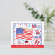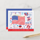 A budget price SMALLER 4.5” x 5.6” alternative. Available in a SEMI-GLOSS 110 lb CARD STOCK which is the default option (thicker for invitations), OR a SATIN FINISH 80 lb THINNER PAPER STOCK (ideal for enclosures). Envelopes are an optional extra and are slightly larger than the card size. This fun design is bursting with lots of elements in red, white and blue Stars and Stripes with our party details on the back. Easily personalise the text.