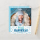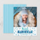 “Happy Hanukkah.” Fun, playful, whimsical handcrafted typography and a random Star of David pattern in light turquoise blue, overlaying light turquoise blue hand drawn lines on a white background, along with the photo of your choice, help you usher in Hanukkah. Hand drawn white lines overlay a light blue background on the back. Feel the warmth and joy of the holiday season whenever you send this stunning, colourful, personalised budget Hanukkah greeting card. Matching stickers, pillows, wrapping paper, serving trays, home décor, and more are also available. Make this Hanukkah one to remember!