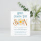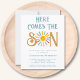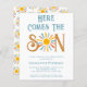 Invite family and friends to your baby boys' baby shower with this sun-themed budget baby shower invitation. It features the text "Here Comes The Son" in blue retro typography with a bright watercolor sun. The back is decorated with a sun pattern. Easily customisable. Original Watercolor © Michele Davies.