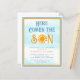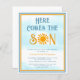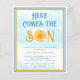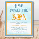 Invite family and friends to your sun-themed baby shower with this budget boys' baby shower invitation. It features the text "Here Comes The Son" in stylish retro typography with a yellow watercolor sun on a blue sky background. Easily customisable. Because we create our artwork you won't find this exact image from other designers. Original Watercolor © Michele Davies.