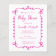 This trendy girl's baby shower invitation features a whimsical scribble border of hand-drawn curlicues and bows in hot pink. Personalise the handwritten hot pink text with the name of the mum-to-be and all the important details. The back of the card is solid hot pink.