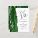 The left-hand edge of this elegant modern wedding save the date card features a hunter green watercolor agate border trimmed with faux silver glitter. The customisable text combines charcoal grey handwriting, copperplate and italic fonts on a white background. The reverse side features a matching hunter green and silver agate design.