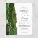 The left-hand edge of this elegant modern wedding invitation features a hunter green watercolor agate border trimmed with faux gold glitter. The customisable text combines handwriting, copperplate and italic fonts in charcoal grey on a white background. The reverse side features a matching green and gold agate design.