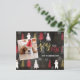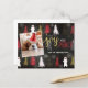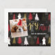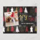 This holiday card features a horizontal photo set against a dark forest background with red and gold trees and whimsical accents. The phrase “Joy and Peace” is rendered in mixed metallic-style typography.