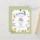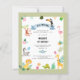 Cute jungle safari animals themed birthday invitation featuring tropical animals, an exotic bird, and other cute party elements. Send out the invites and celebrate the first birthday of the wild one with friends and family.