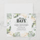 Wild, calm, and elegant boys safari animal baby shower invitation featuring a giraffe, gold effect and green leaves. Perfect for boys baby shower invitations