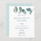 A budget price SMALLER 4.5” x 5.6” alternative. Available in a SEMI-GLOSS 110 lb CARD STOCK which is the default option (thicker for invitations), OR a SATIN FINISH 80 lb THINNER PAPER STOCK (ideal for enclosures). Envelopes are an optional extra and are slightly larger than the card size. . A branch of elegant blue eucalyptus leaves decorates the top and stylish typography is below which is easily personalised to the details of your Bachelorette Party. On the reverse is your itinerary which again can easily be personalised. You can change the background colours on both sides, as well as the text to a different colour if you so wish via the Click to Customise Further option.