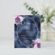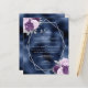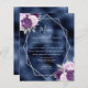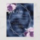 This elegant modern wedding menu features a silver geometric frame decorated with lilac, purple and silver floral bouquets on a navy blue faux foil background. The customisable text combines silver grey whimsical handwriting, copperplate and italic fonts.