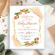 This citrus themed baby shower invitation features a gold geometric frame adorned with watercolor oranges. The customisable text is in modern orange script font and charcoal grey sans serif. Personalise it with the name of the mum-to-be and shower details. The back of the card is a pastel shade of orange matching the watercolor highlights on the front. Ideal for a summer baby shower!