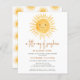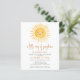 Are you planning a sun-themed baby shower? This budget baby shower invitation features the text "A little ray of sunshine is almost here!" with a cute watercolor smiling yellow sun. There is a cute sun pattern on the back. Perfect for a gender-neutral baby shower. Easily customisable. Original Watercolor © Michele Davies.