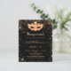 For an elegant Masquerade, Sweet 16, 16th birthday. A stylish black background. Decorated with faux gold glitter dust and a masquerade mask. Personalise and add a name, age and party details. The name is written with a hand lettered style script