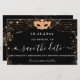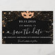 A girly and trendy Save the Date card for a 50th (or any age) birthday masquerade party. A classic black background decorated with faux gold glitter dust and a masquerade mask. Personalise and add a date and name/age. The text: Save the Date is written with a large trendy hand lettered style script.