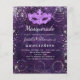 For an elegant Masquerade, Quinceañera, 15th birthday. A deep purple floral lace pattern as background. Decorated with faux silver glitter dust and a masquerade mask. Personalise and add 5 photos, a name, age and party details. The name is written with a hand lettered style script