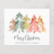 Budget-friendly elegant Christmas card featuring a watercolor abstract of pine trees in muted sage green, red, gold and orange and "Merry Christmas" in a stylish script. Add a personalised seasonal greeting and your names in a signature-like script on the back.