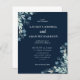 Modern wedding invitation. Featuring flourishes of rustic foliage and tiny blue flowers on an navy blue background. Easy to customise with your unique information.