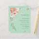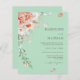 This modern and elegant green and floral wedding invitation features a beautiful wedding bouquet using peachy pink and white flowers with greenery and white ribbons, on top of some rose-gold sparkles. The rose petal confetti adds an additional final ‘wedding day’ touch.